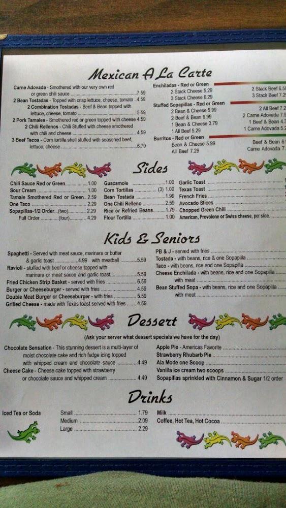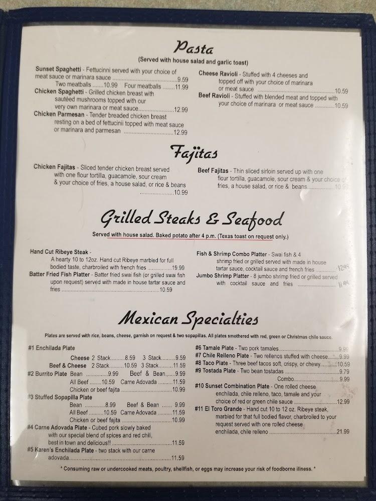 The menu at Sunset Grill features a delightful mix of Mexican specialties and comfort food. Highlights include carne adovada, enchiladas, and flavorful chili relleno, each dish crafted for taste and authenticity. For lighter options, the grilled fish and salads provide fresh alternatives. The children's menu is designed for family-friendly dining. Satisfy your sweet tooth with desserts like chocolate sensation and apple pie, offering delicious conclusions to your meal. Expect variety with around 60 different items, catering to all palate preferences.